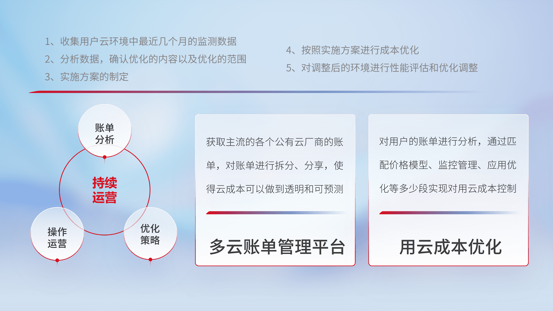 通过多云纳管,,以统一的资源数据模型把客户的云资源进行抽象和封装,,,进而实现对多云资源的统一操作,,,,保障云资源管理的可靠性、、、、稳定性与可用性。。。。量身定制化运维内容,,,,配置、、开发运维、、、、补丁管理、、、、备份、、、监控、、认证和访问管理、、、审计和日常巡检等,,,,保障在用云过程中的可靠度,,稳定度以及高可用率。。。