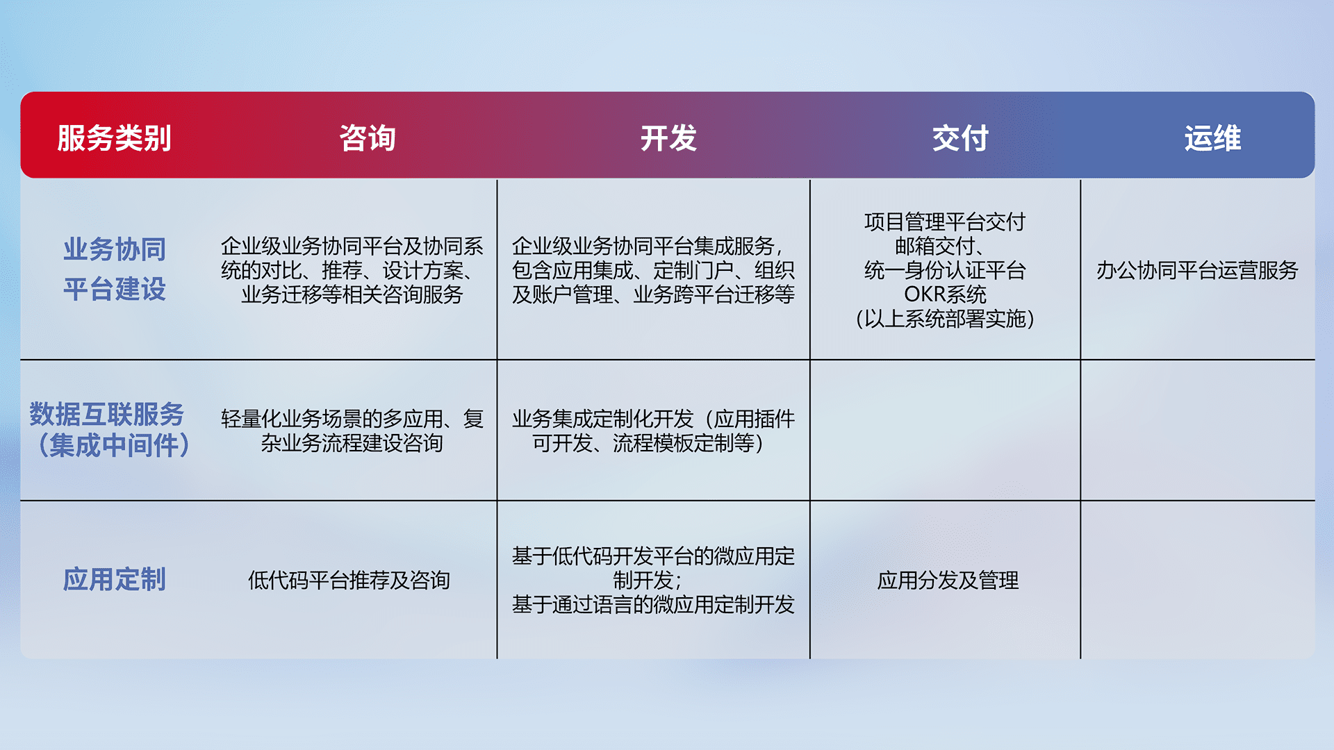 针对钉钉、、企微、、、、IDaas等平台级产品提供产品的规划、、、、方案、、交付、、、定制化开发等服务,,,,实现如统一协同办公、、、智能客户服务、、、混合会议管理、、智能数据查询、、等业务场景,,,实现数字化转型。。